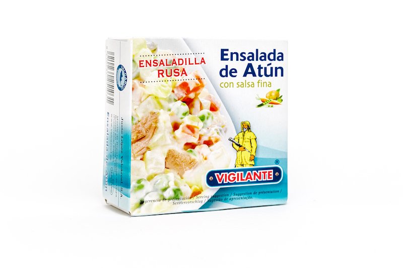 Salsa fina (agua, aceite de girasol, vinagre, almidón de maiz modificado, yema de huevo, azúcar, sal, estabilizantes: E-412, E-415, aroma*, conservadores: E-202, E-211, antioxidante: E-385), mezcla de vegetales en proporción variable (patata, zanahoria, judías, guisantes y aceitunas) y atún (25%).